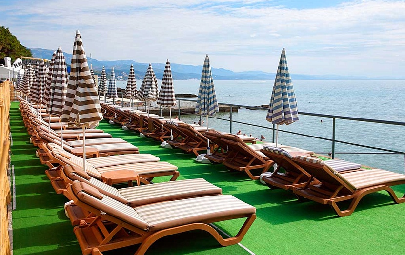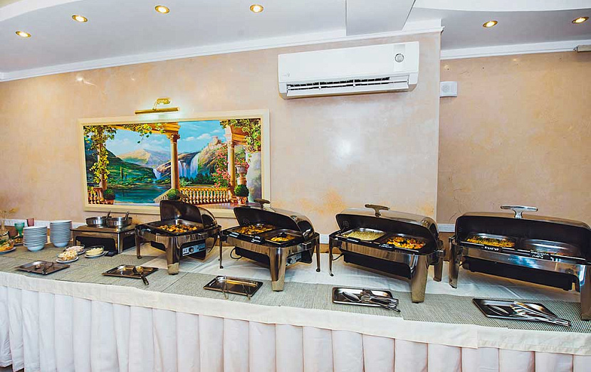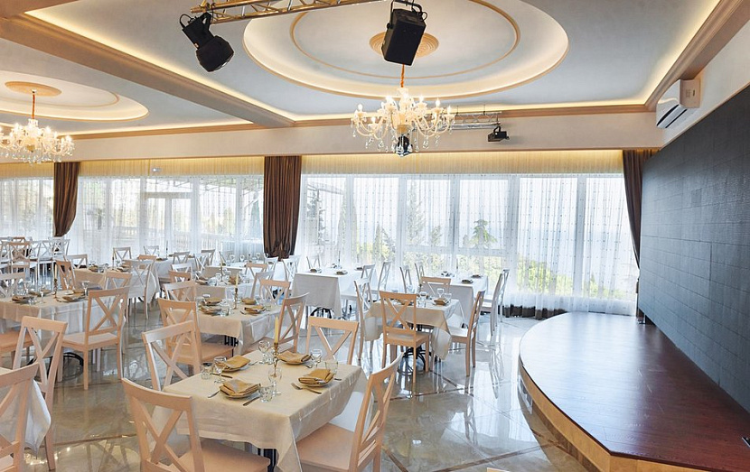 Для гостей предусмотрено два типа питания - "Завтраки" или "Полный пансион плюс" по системе «шведский стол». Обеденный зал и летняя терраса с панорамным видом на море, горы и парк, расположены на четвертом уровне комплекса. Премиальное кеговое пиво на обед и ужин доступно для гостей.